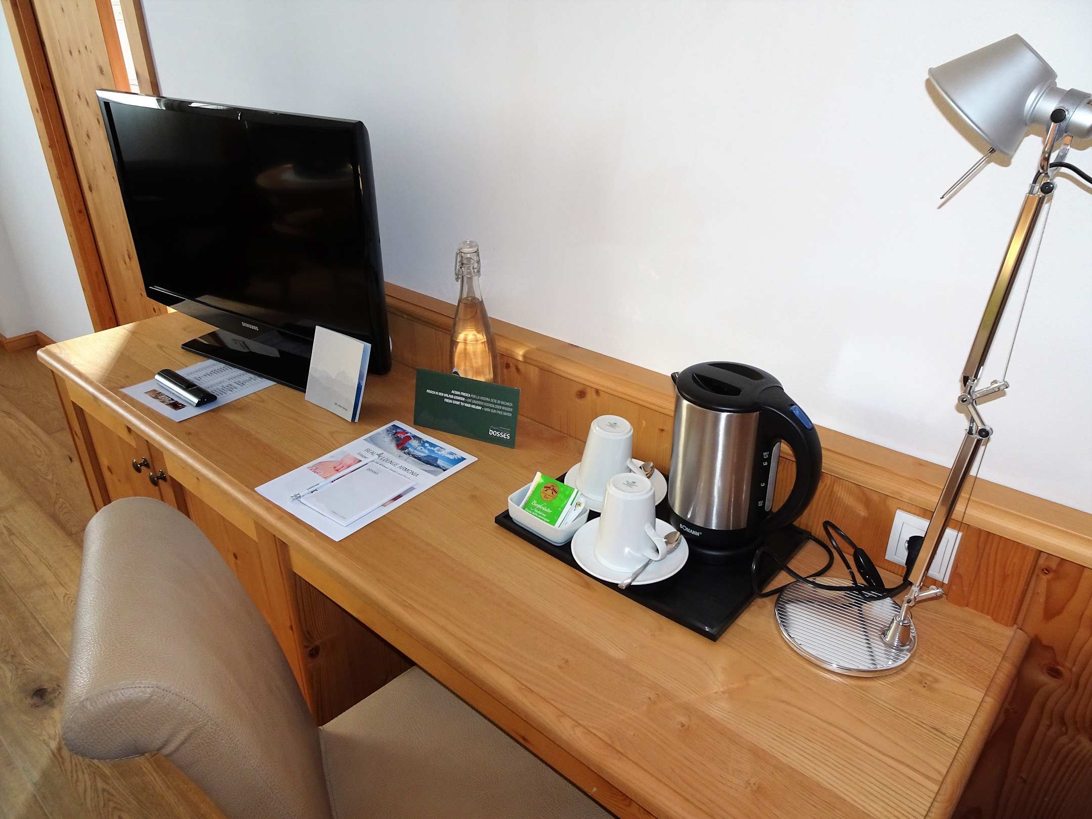 Schreibtisch mit SAT-TV und Wasserkocher