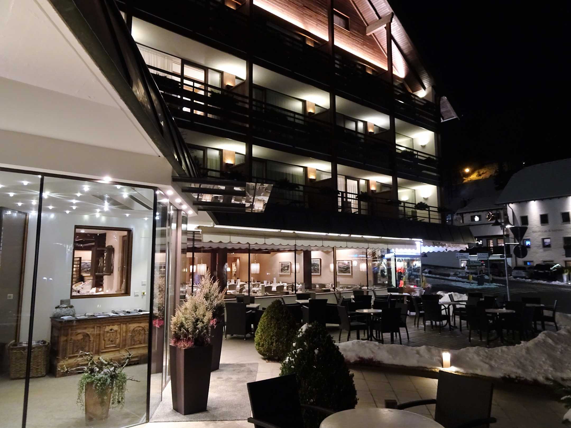 Abendlicher Blick auf das Hotel Dosses mit Eingangsbereich und Speisesaal