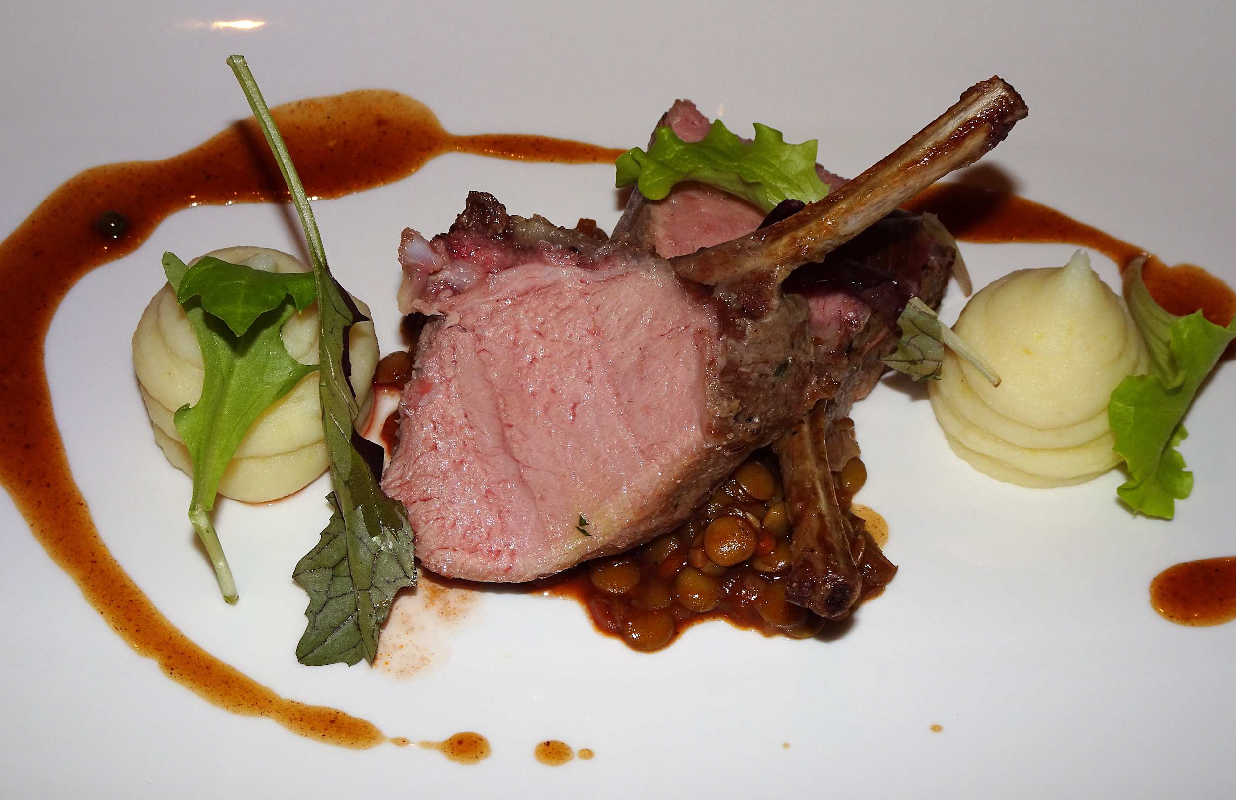 GastroAbendessen im Hotel Dosses: Rosa gebratene Wildschweinracks mit Pfeffersauce, Kartoffelpüree und Gemüselinsen