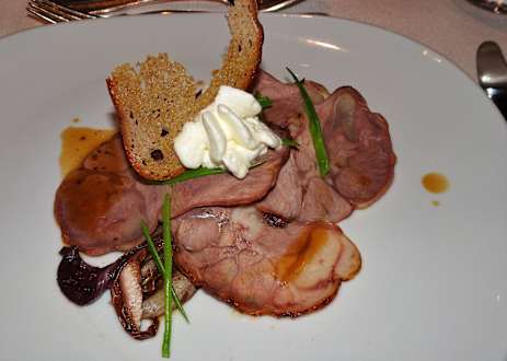 Abendessen im Hotel Dosses: Carpaccio von der Kalbsstelze mit Radicchio und Meerrettich