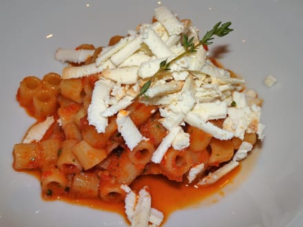 Abendessen im Hotel Dosses: Maccheroncini mit Tomatenpesto und Räuchertopfen