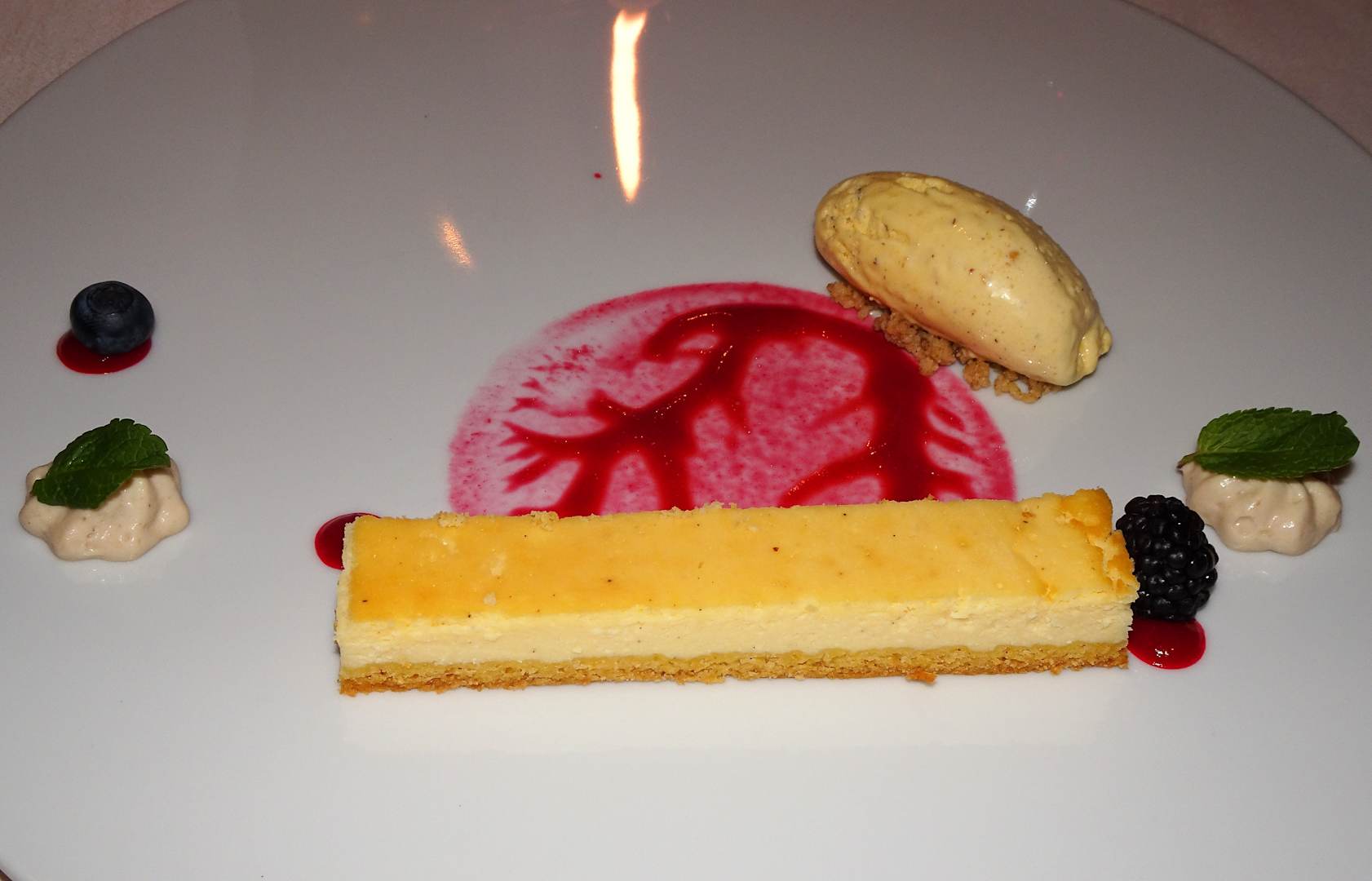 Abendessen im Hotel Dosses: Karamellisierte Topfenschnitte mit Waldfrüchten und Haselnusseis