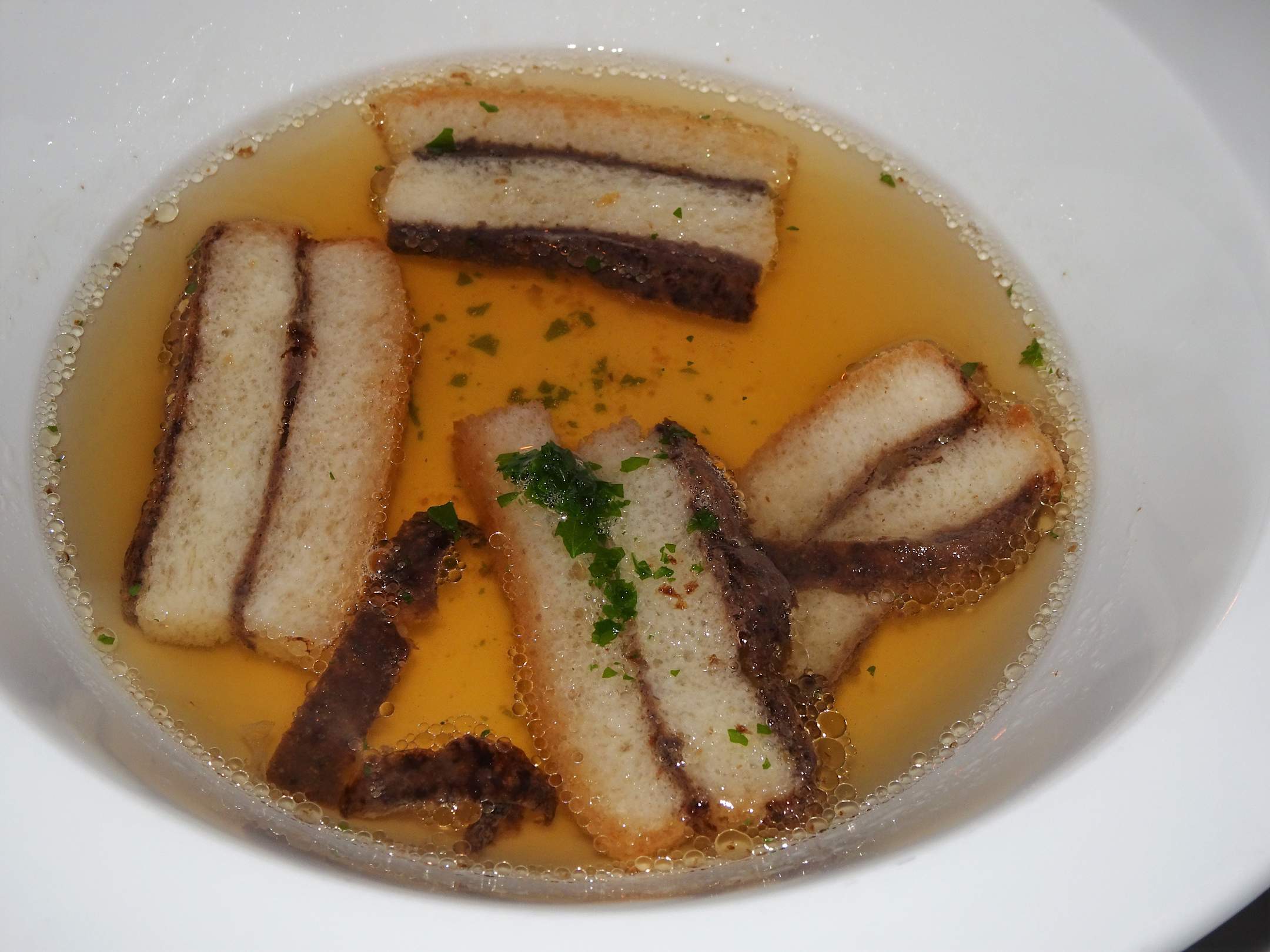 Abendessen im Hotel Dosses: Rinderconsommé mit Milzschnitten und Petersilie