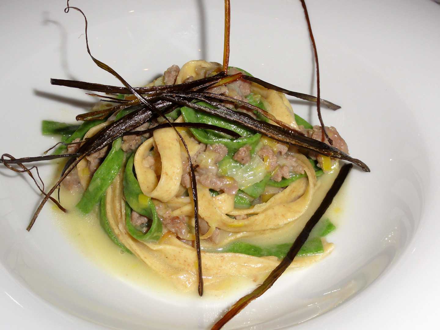 Hausgemachte Tagliatelle "Heu und Stroh" mit Lauch und Wurst