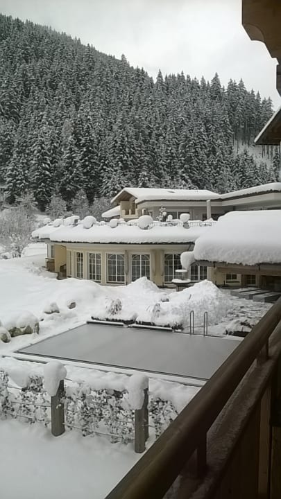 Blick vom Zimmer auf die Verschneite Terrasse und den Außenpool.