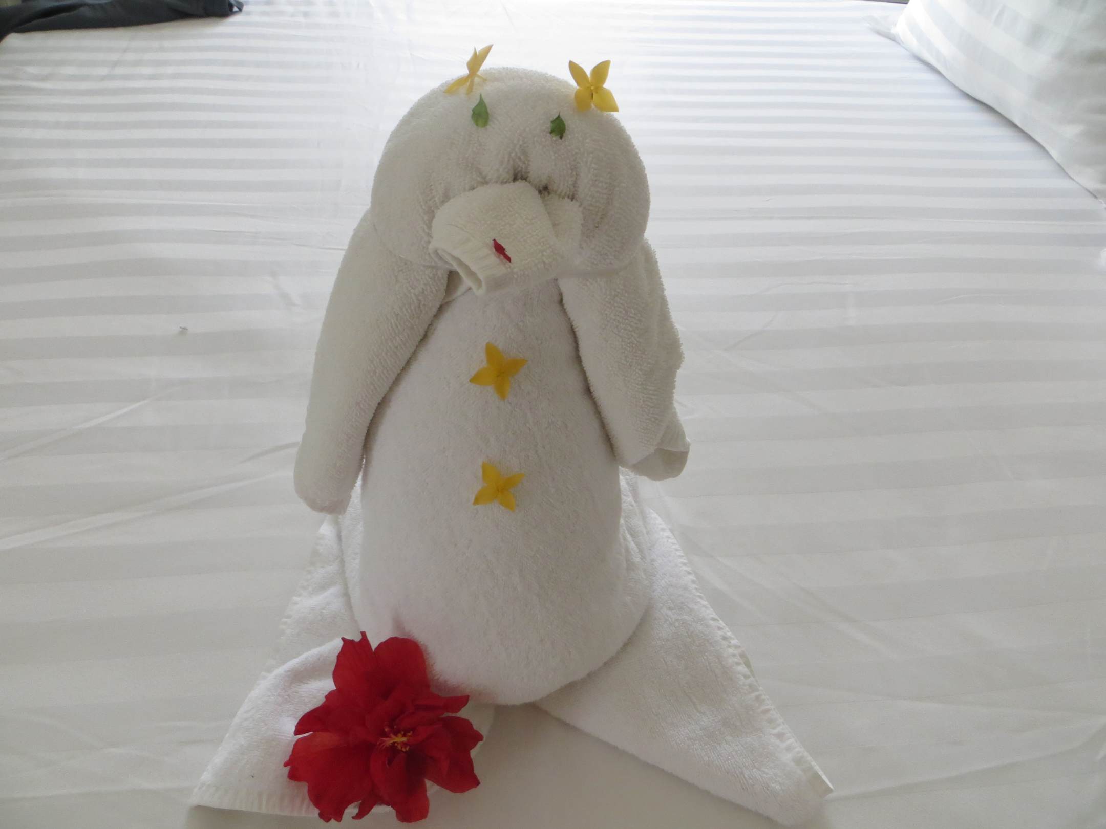 Täglich neue Handtuchfiguren auf dem Bett