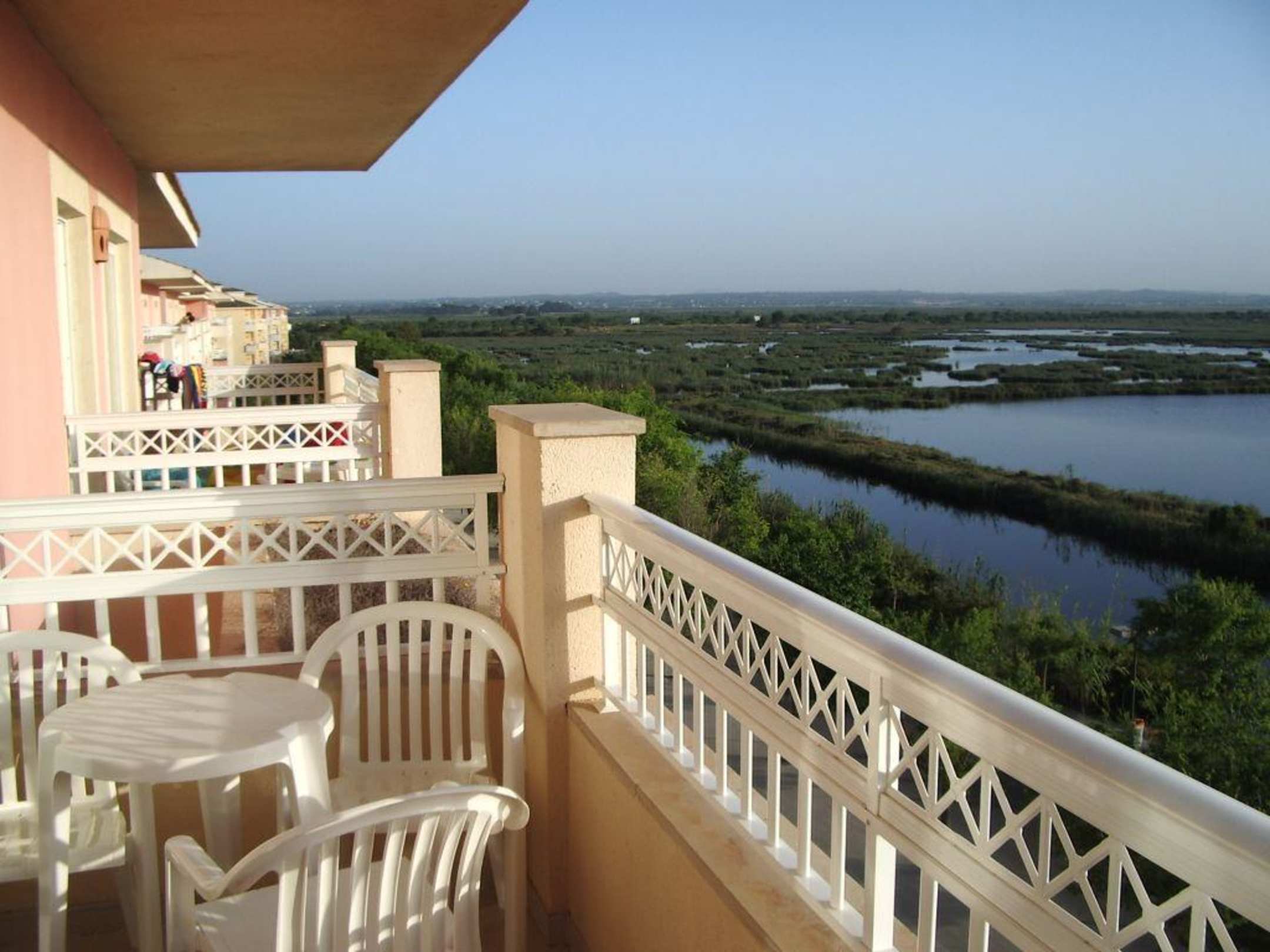 Hier sieht man unsern Balkon im dritten Stock. Der Balkon ist aber noch ein bisschen größer als er hier aussieht. Im Hintergrund ist das Naturschutzgebiet s'Albufera.
