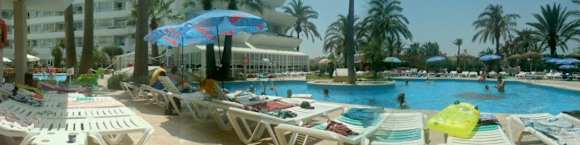 Panoramabild über den Poolbereich. In der Bildmitte der Speisesaal...