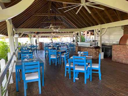 GastroRetaurant Mediterrenas. Offen mit Meerblick. Abends bis zu vier Gänge - kein Buffet. Mittags kleines Buffet. Großes Mittagsbuffet im Le Marche