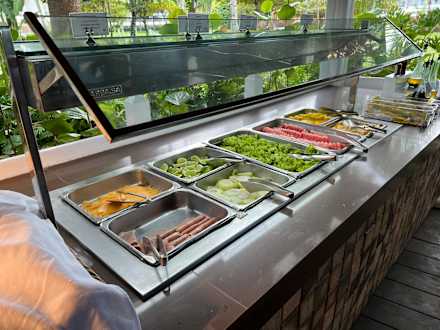 GastroRetaurant Mediterrenas. Offen mit Meerblick. Abends bis zu vier Gänge - kein Buffet. Mittags kleines Buffet. Großes Mittagsbuffet im Le Marche