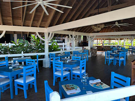 GastroRetaurant Mediterrenas. Offen mit Meerblick. Abends bis zu vier Gänge - kein Buffet. Mittags kleines Buffet. Großes Mittagsbuffet im Le Marche
