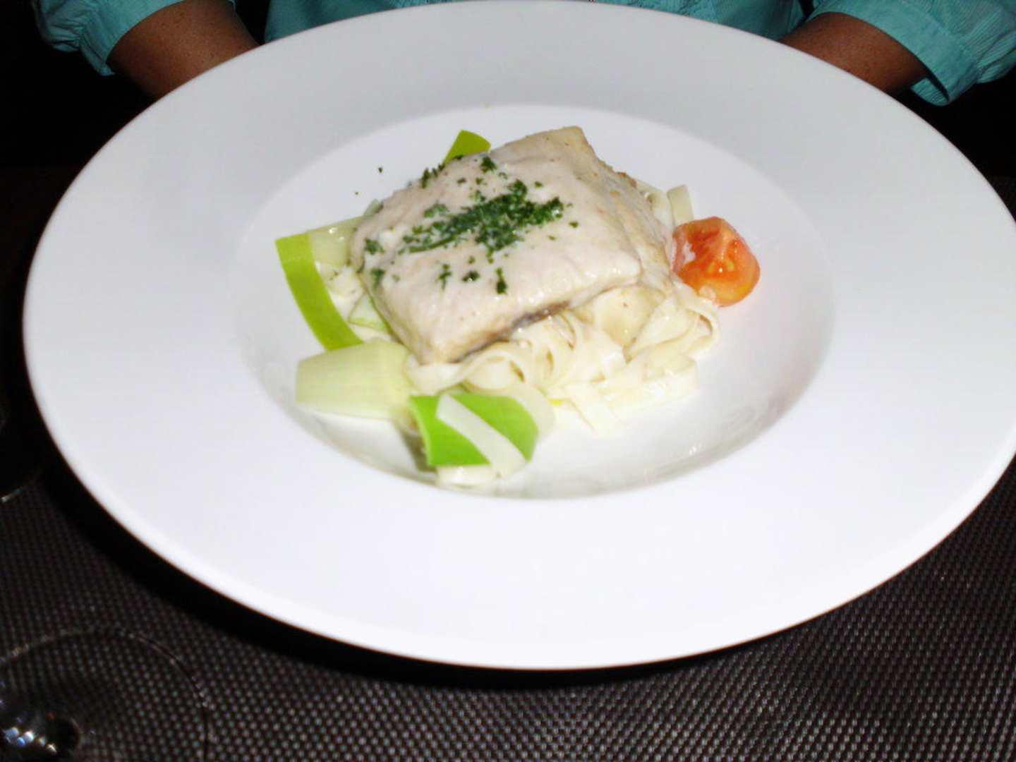 Gebratene Meeräsche mit Lauch , Tomaten & Tagliatelle