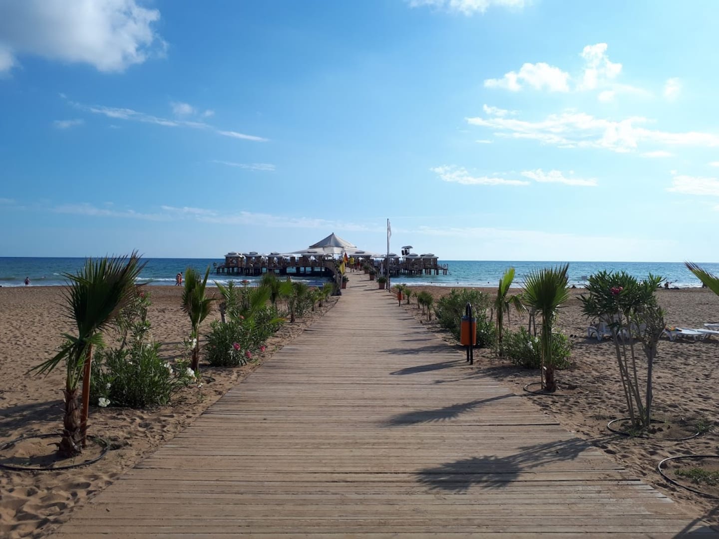 (aus 2019, die Palmen sind schon viel größer) Hoteleigener Steg mit Bar