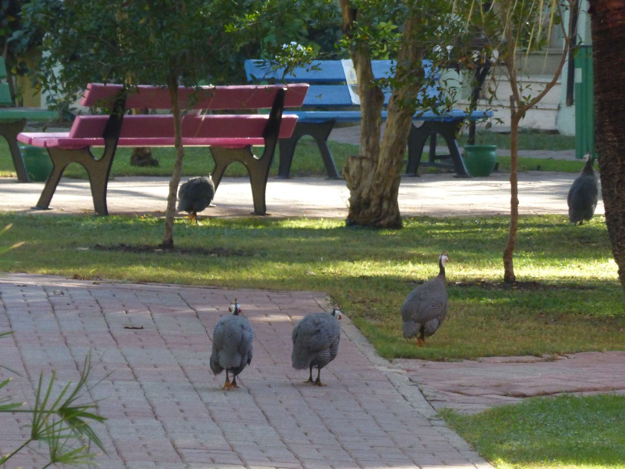 Perlhühner auf ihrem täglichen Spaziergang durch die Anlage