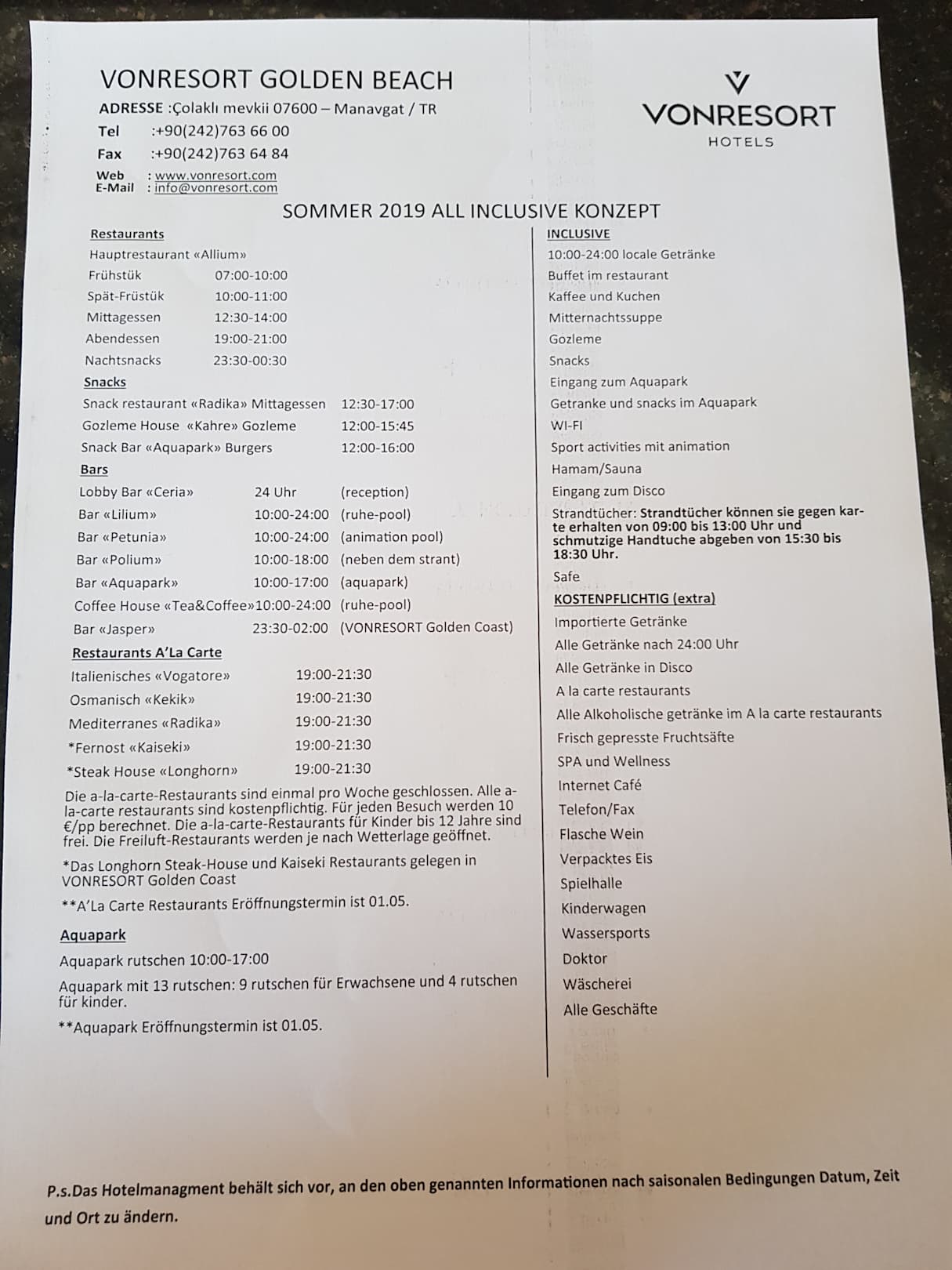 Uhrzeiten der Restaurants