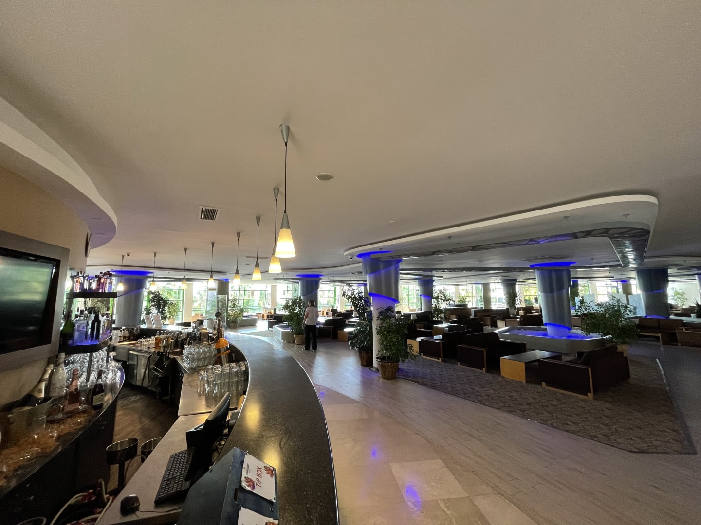 Bar und Lobby mit Ausblick auf den Pool