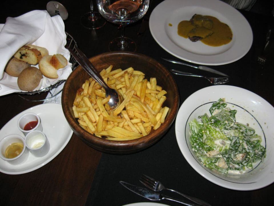 Restaurant français à la cartepetits pains à l'ail , salade cesaer , frites , steaks sauce voyage belek select , vin rouge.