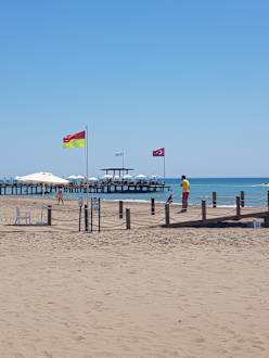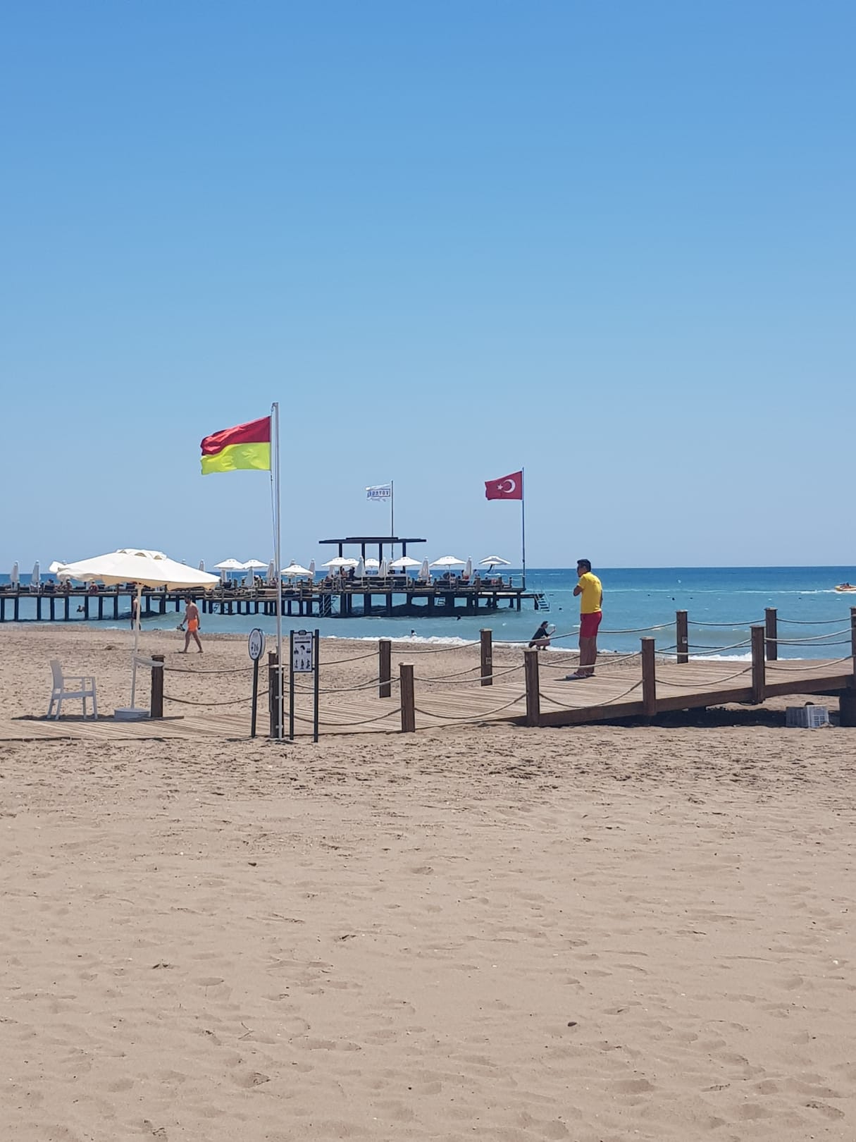 Blick vom Strand zum Familien Steg mit Bar
