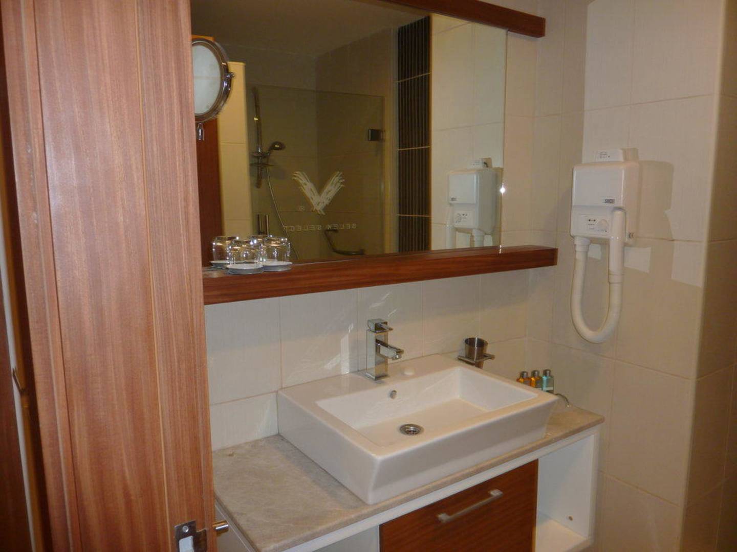 Badezimmer im Familienzimmer (6722) mit Fön und Dusche (aber KEINE Badewanne), stilvolle und elegante Einrichtung, Steckdosen (für z.B. einen eigenen Fön) nur im Wohnbereich und NICHT im Badezimmer angebracht.
