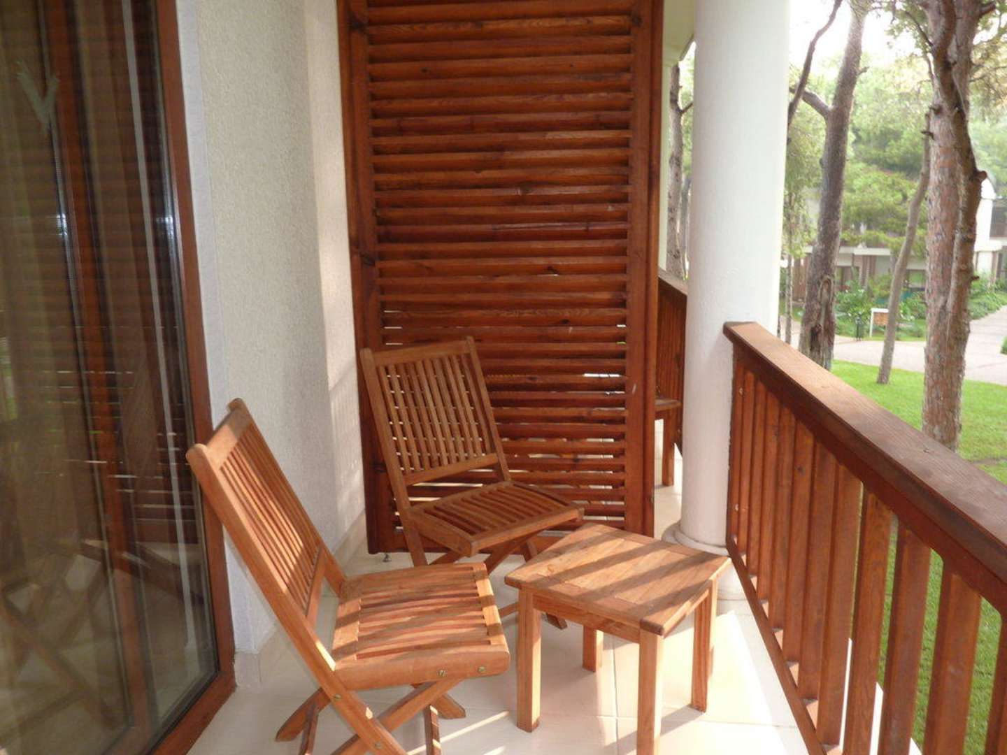 Balkon Familienzimmer (6722)Balkon Familienzimmer (6722) mit 2 Stühlen, 1 Tisch und 1 Wäscheleinevorrichtung. Ausblick in Gartenanlage/Garten.