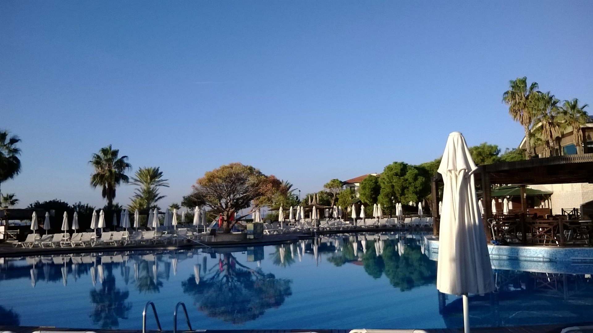 Pool,Palmen und dahinter das Meer