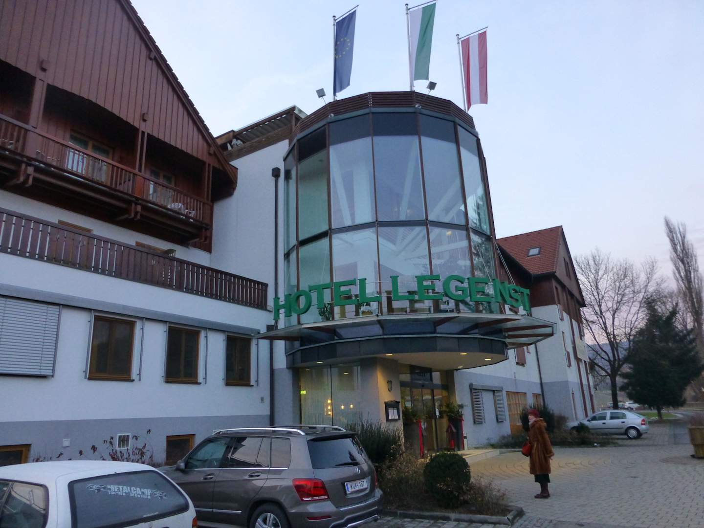 Hoteleingang ohne dem davor stehenden Bildstock