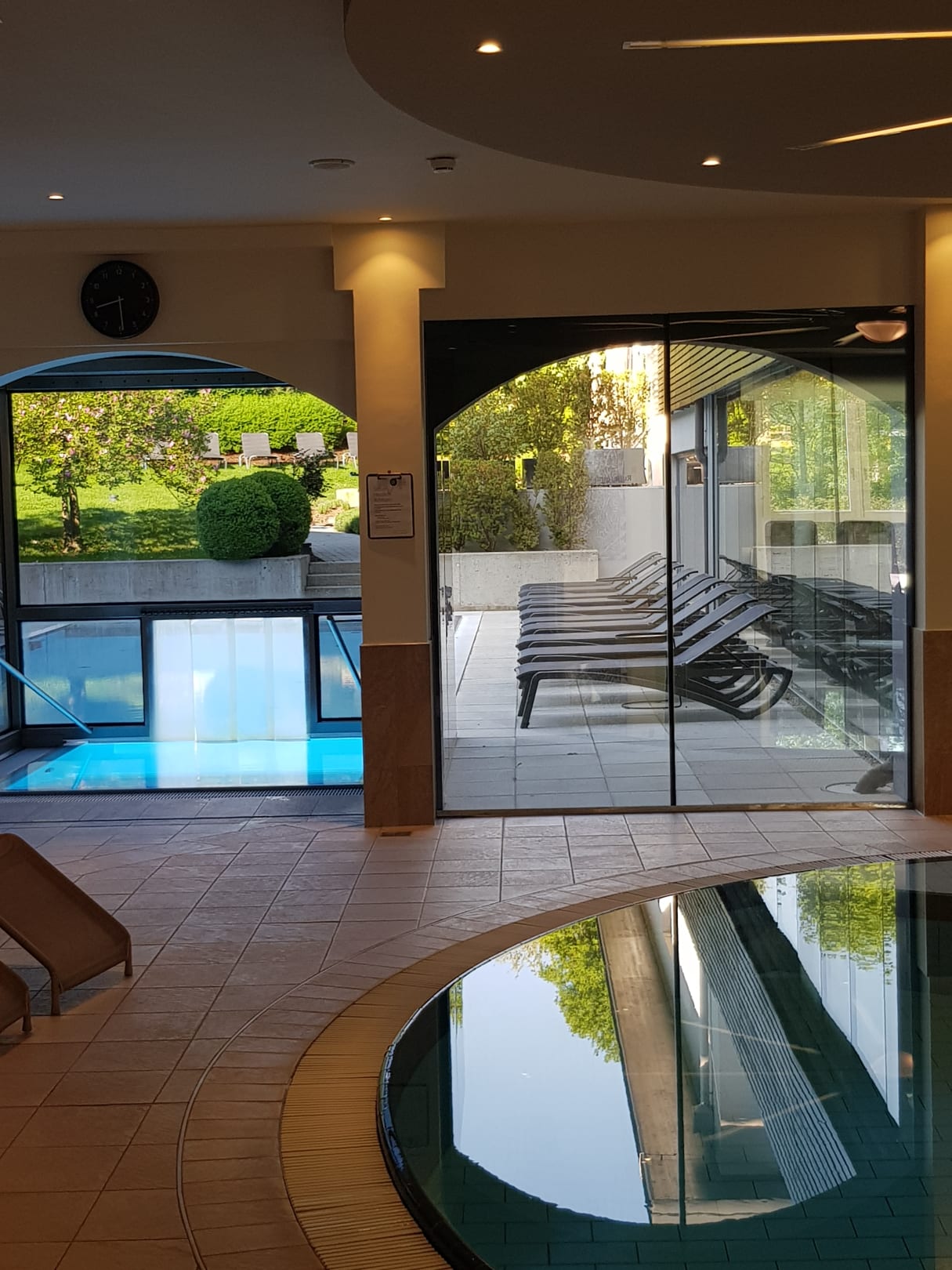 Ausblick vom Innepool auf den Außenbereich