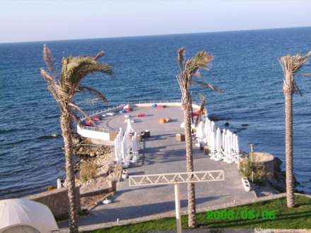 Blick vom Balkon auf die Badeinsel des Hotels Vouni Palace in Girne.