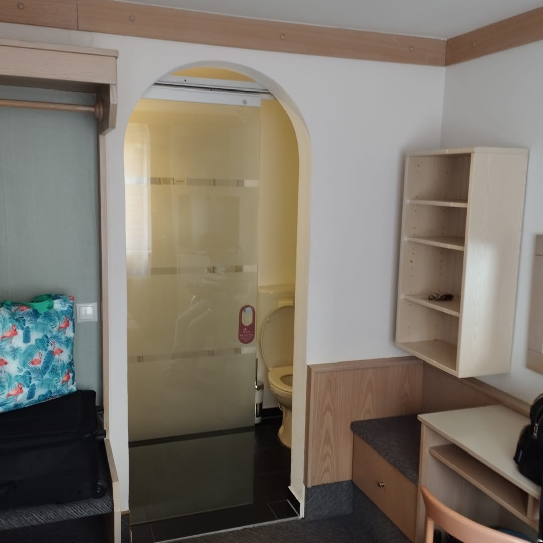 Schiebeglastür vom Zimmer aus. Wenn man ins Zimmer reinkommt steht man vor der Toilette