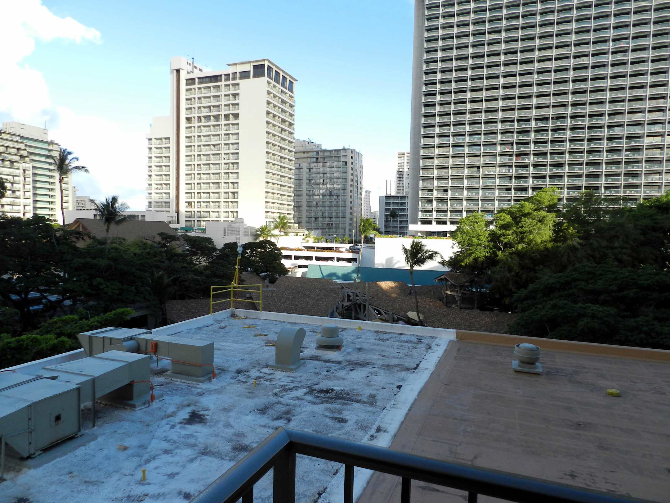 Diese Hotelseite, von der Straße aus rechts und nicht zu sehen, zeigt die Zu- und Abluftanlagen von Küchen und Restaurants. Weiter hinten die Stadt.