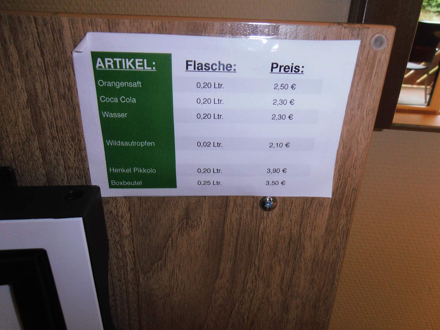Preise der Minibar, wobei das Schnäpschen günstiger als angegeben war.