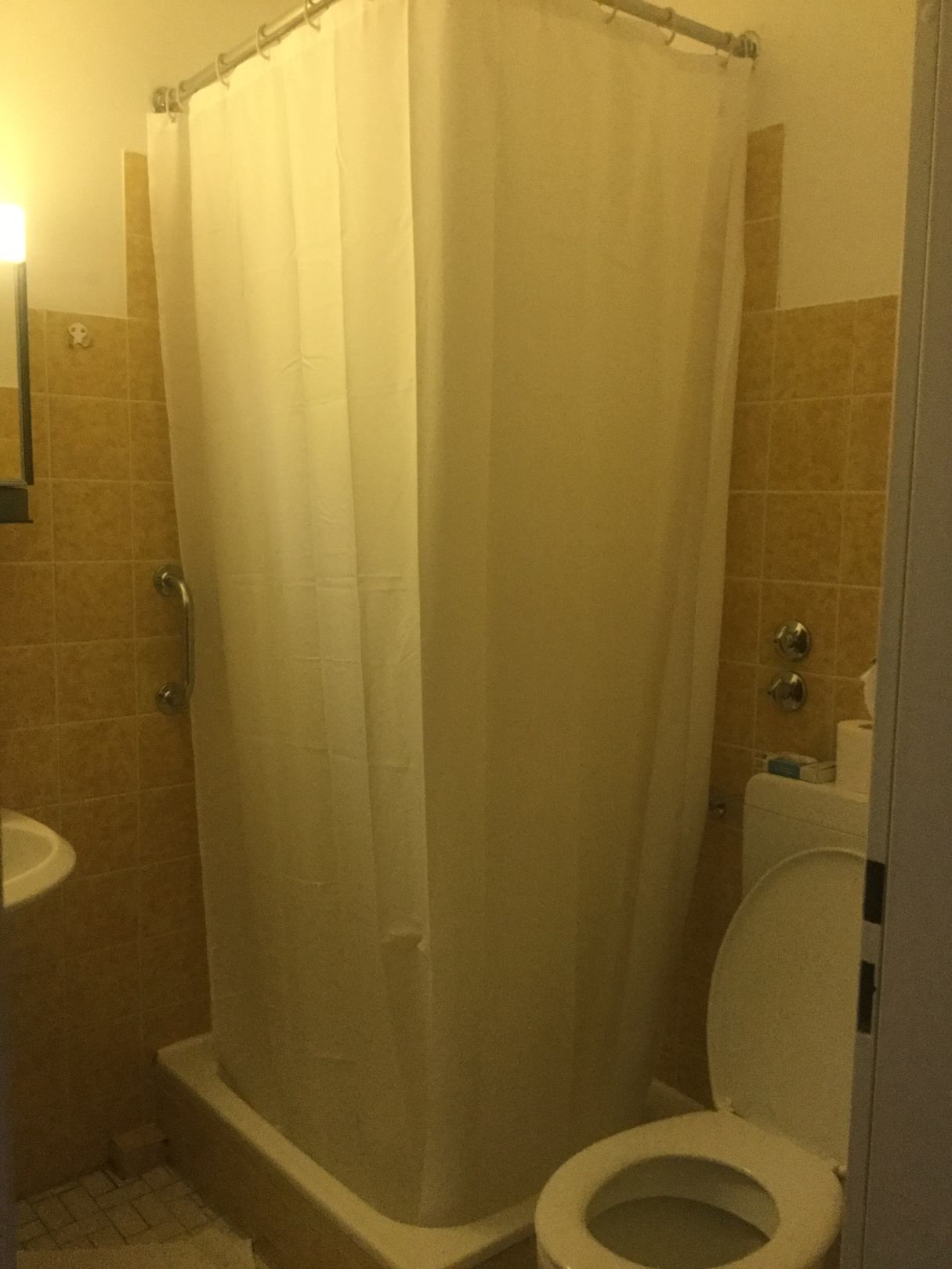 Deutlich in die Jahre gekommenes Badezimmer mit Duschvorhang