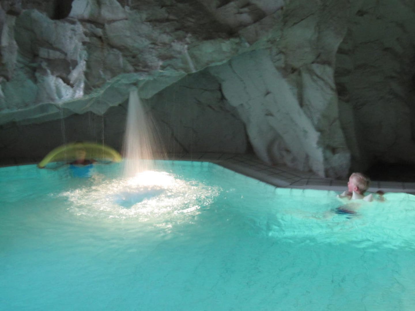 Das Indoor-Schwimmbad des Hotels ist in Form einer Felsgrotte gestaltet. Ein besonderes Highlight für die Kinder ist der Wasserfall, der auf Knopfdruck ausgelöst werden kann.