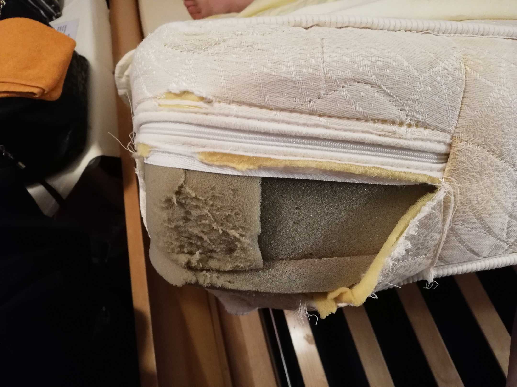 Kaputte Matratze die vom Personal einfach wieder überzogen worden ist.