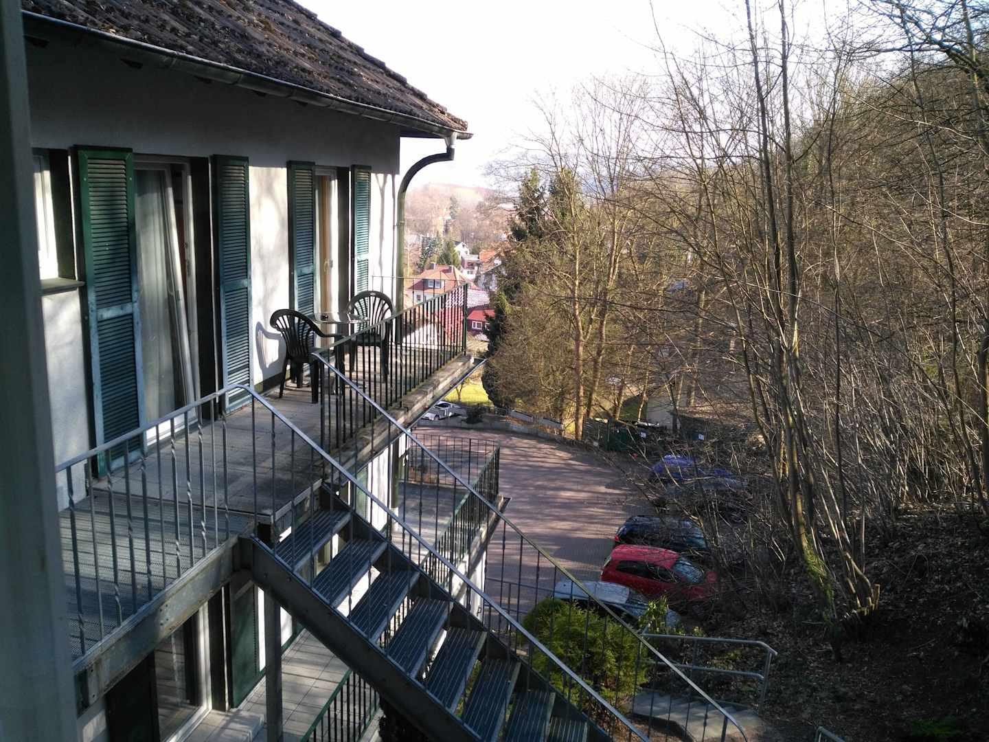 Blick zu Balkon und Parkplatz