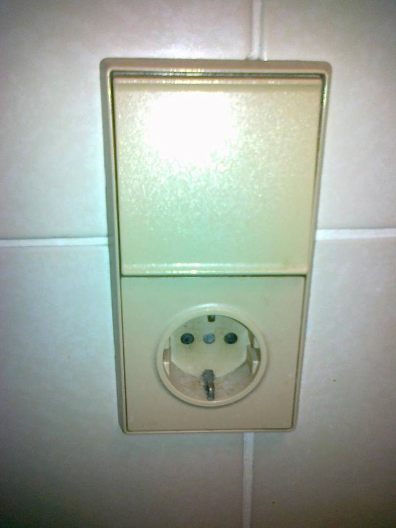 Dreckige und verstaubte Steckdose im Bad.
