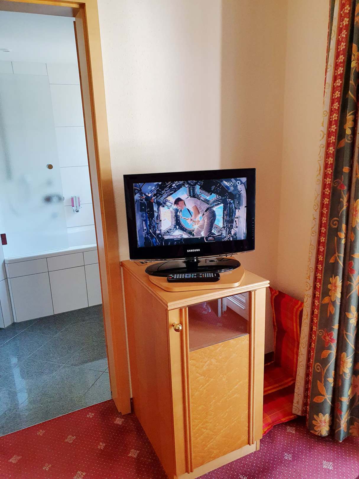 Mini-Fernseher und leere Minibar im Zimmer 41