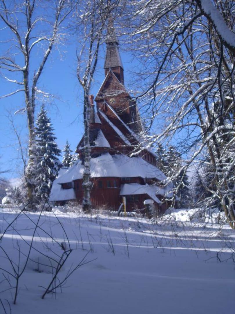 nordische Stabkirche im Schnee direkt gegenüber vom Hotel