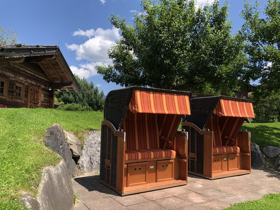 Strandkörbe im Garten (mit Blick zur Blockhaussauna)
