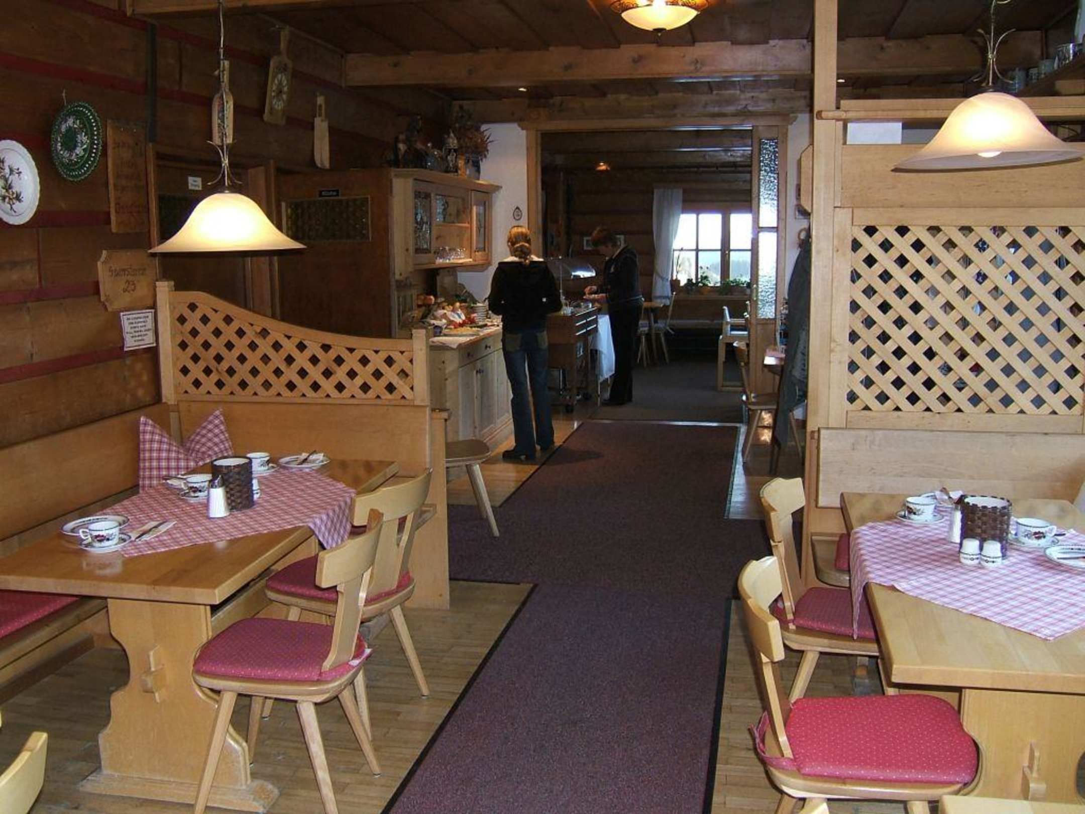 Hier sieht man einen Teil der Gaststätte morgens, gefrühstückt wird hier und das Abendessen wird hier serviert. Tagsüber sind Tagesgäste da und auch Skischulen zu Gast