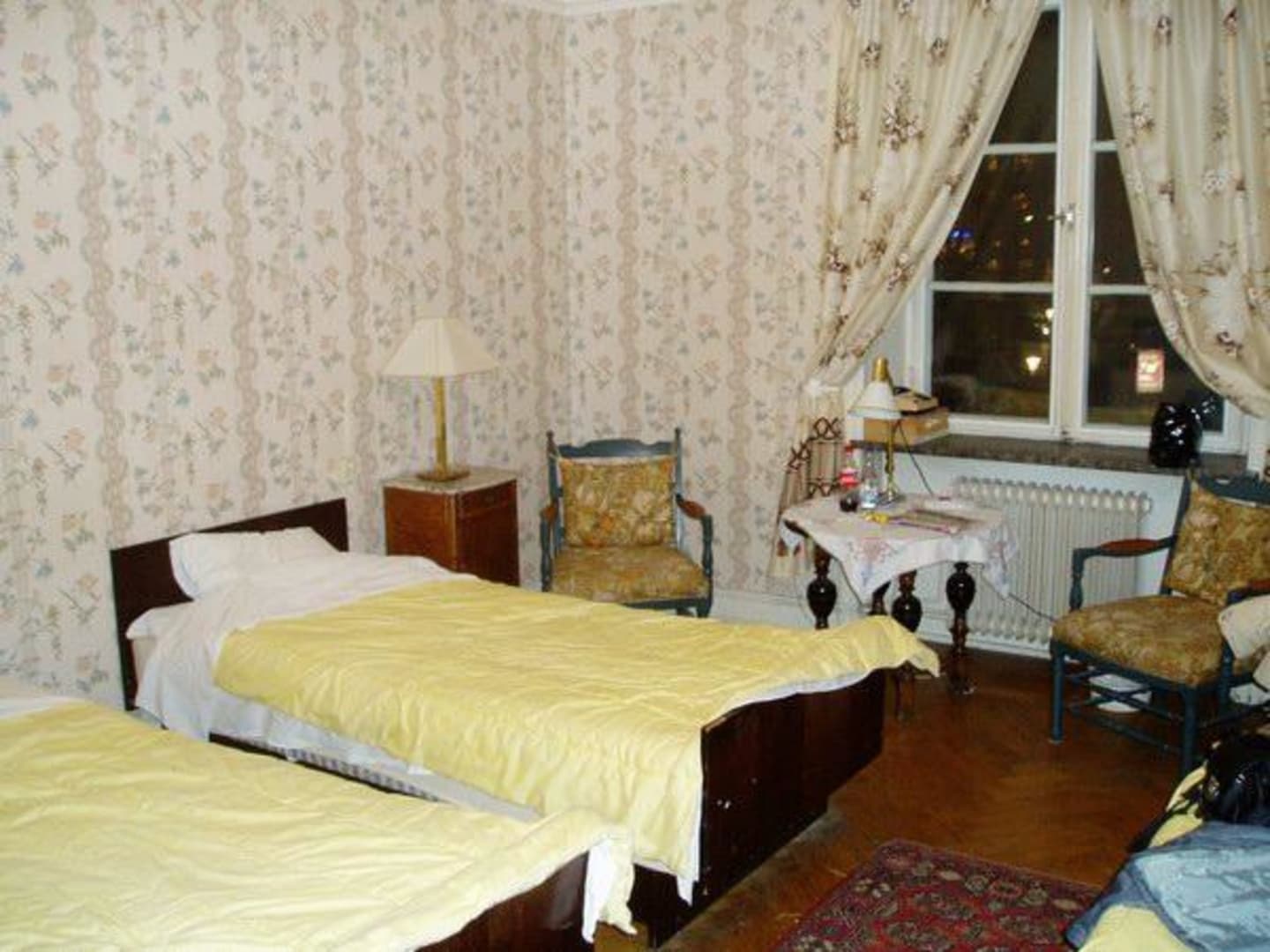 Zwei Betten und was nicht zusehen ist, ein aufgeklapptes und ein zusammengeklapptes Notbett. Aufgenommen von der Eingangstür her.