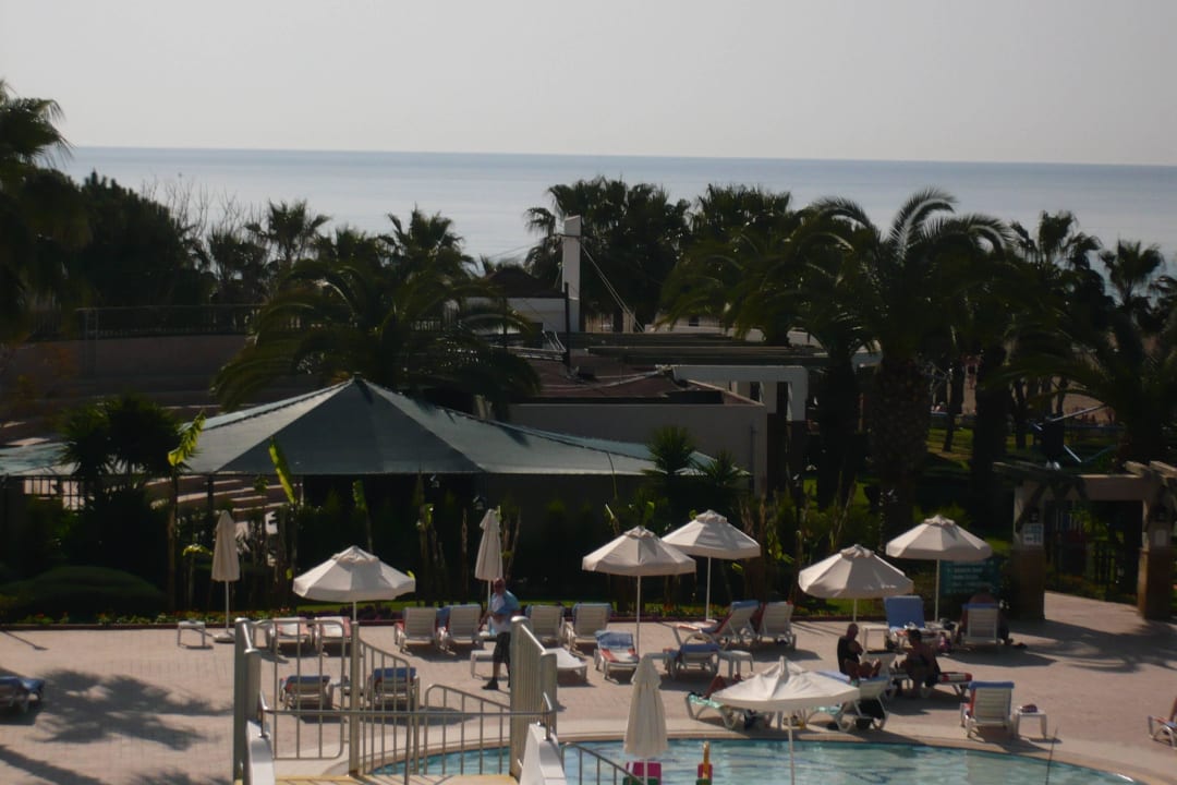Blick über Pool zum Meer, von unserem Zimmer mit Meerblick.