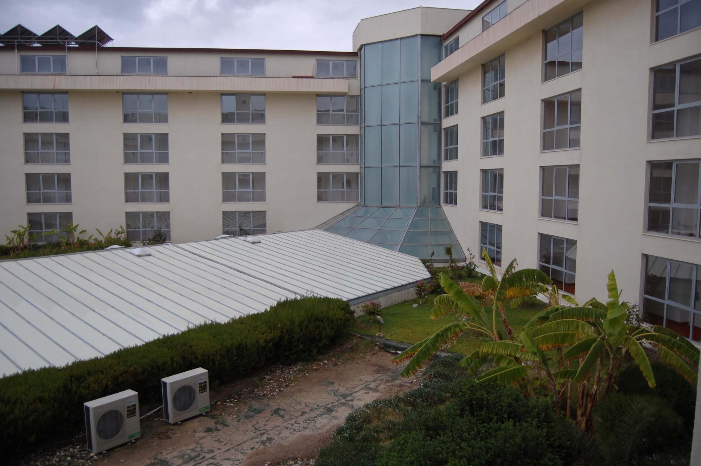 Die "Überdachung" die zu sehen ist ist gleichzeitig das Dach der Lobby und des Speisesaals, dementsprechend laut ist es bei Regen!