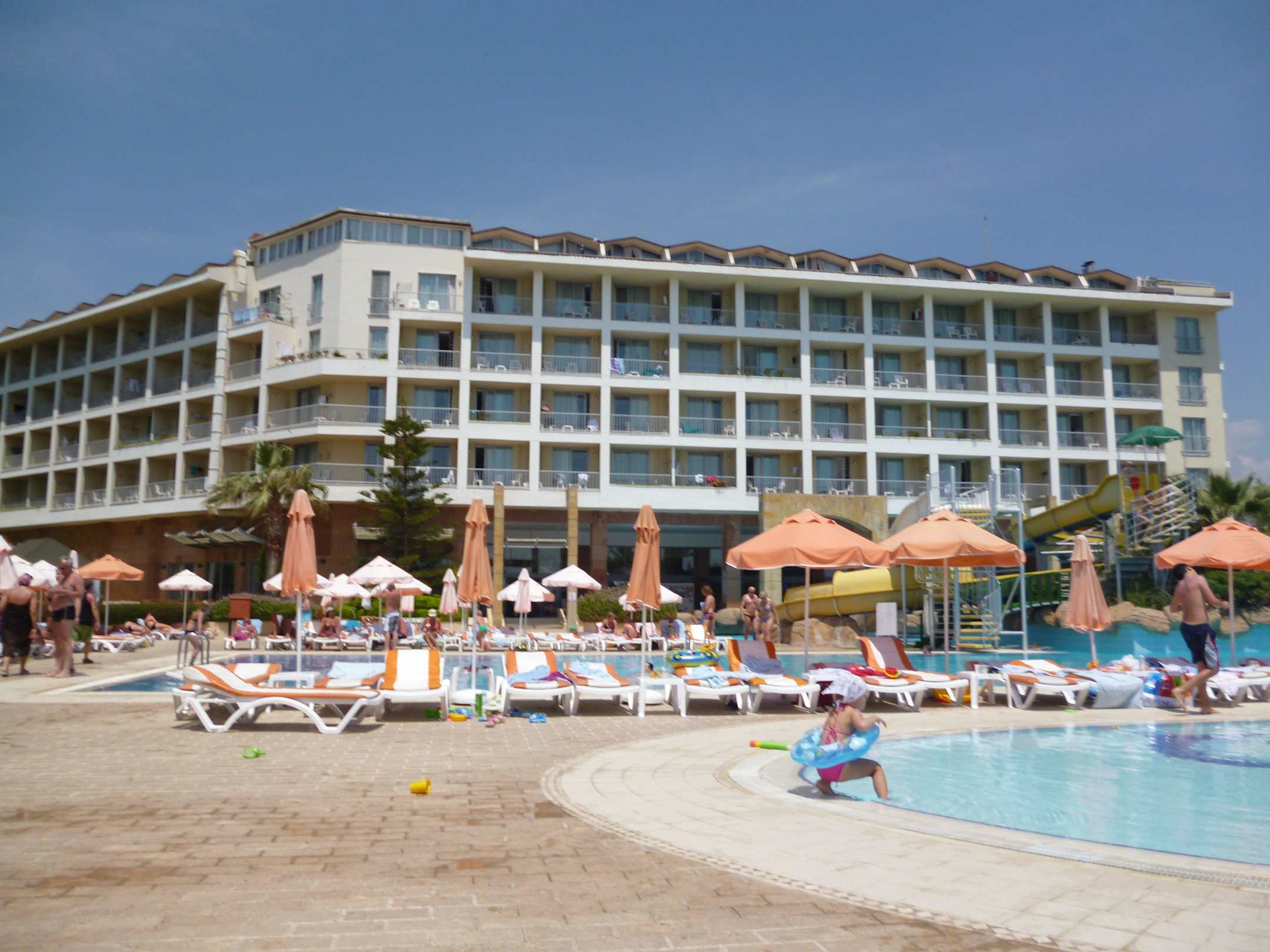 Blick vom Pool auf das Hotel