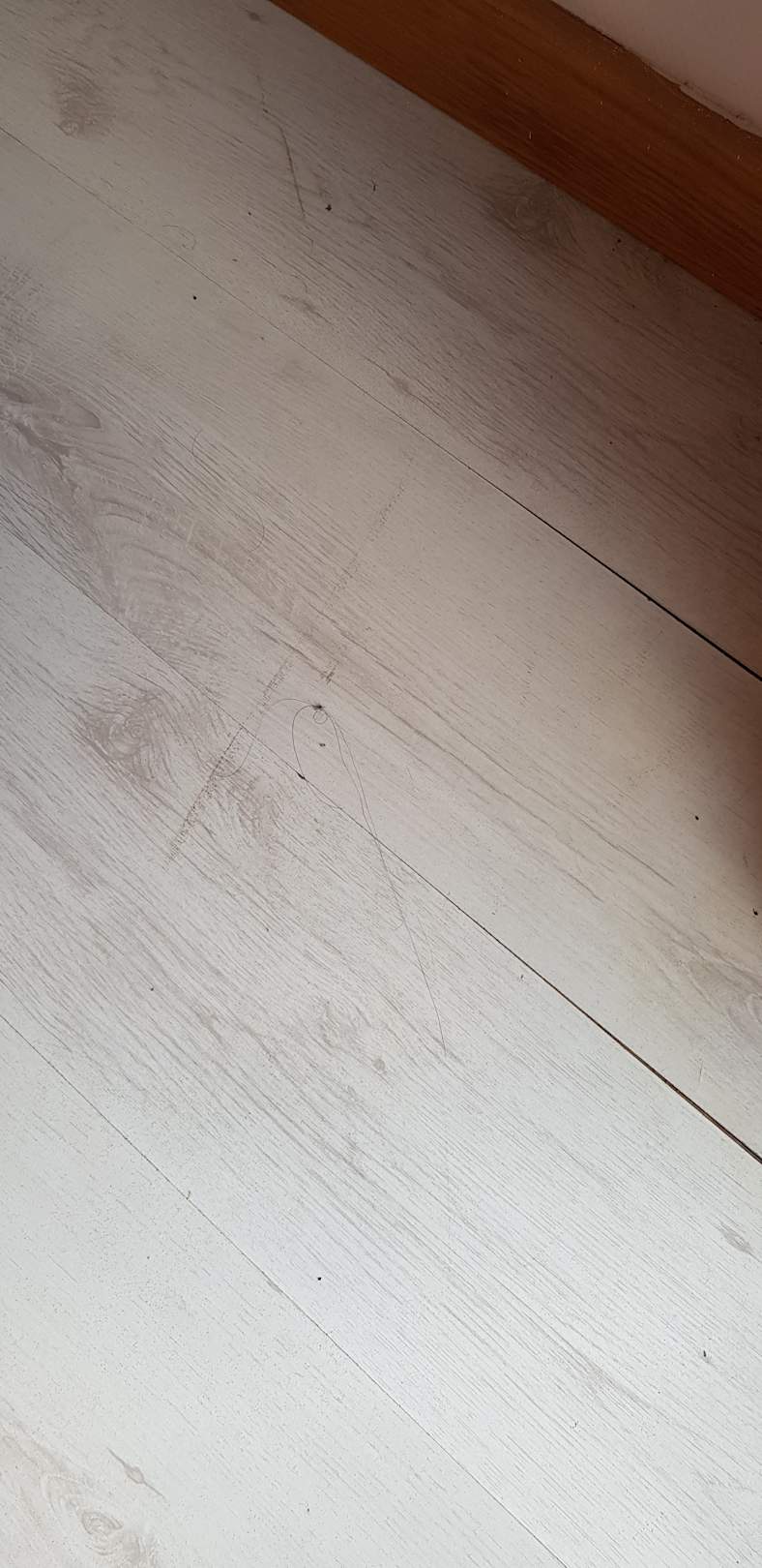 Haare auf dem Boden gleich nach der Reinigung, aber der Staubsauger steht im Gang.