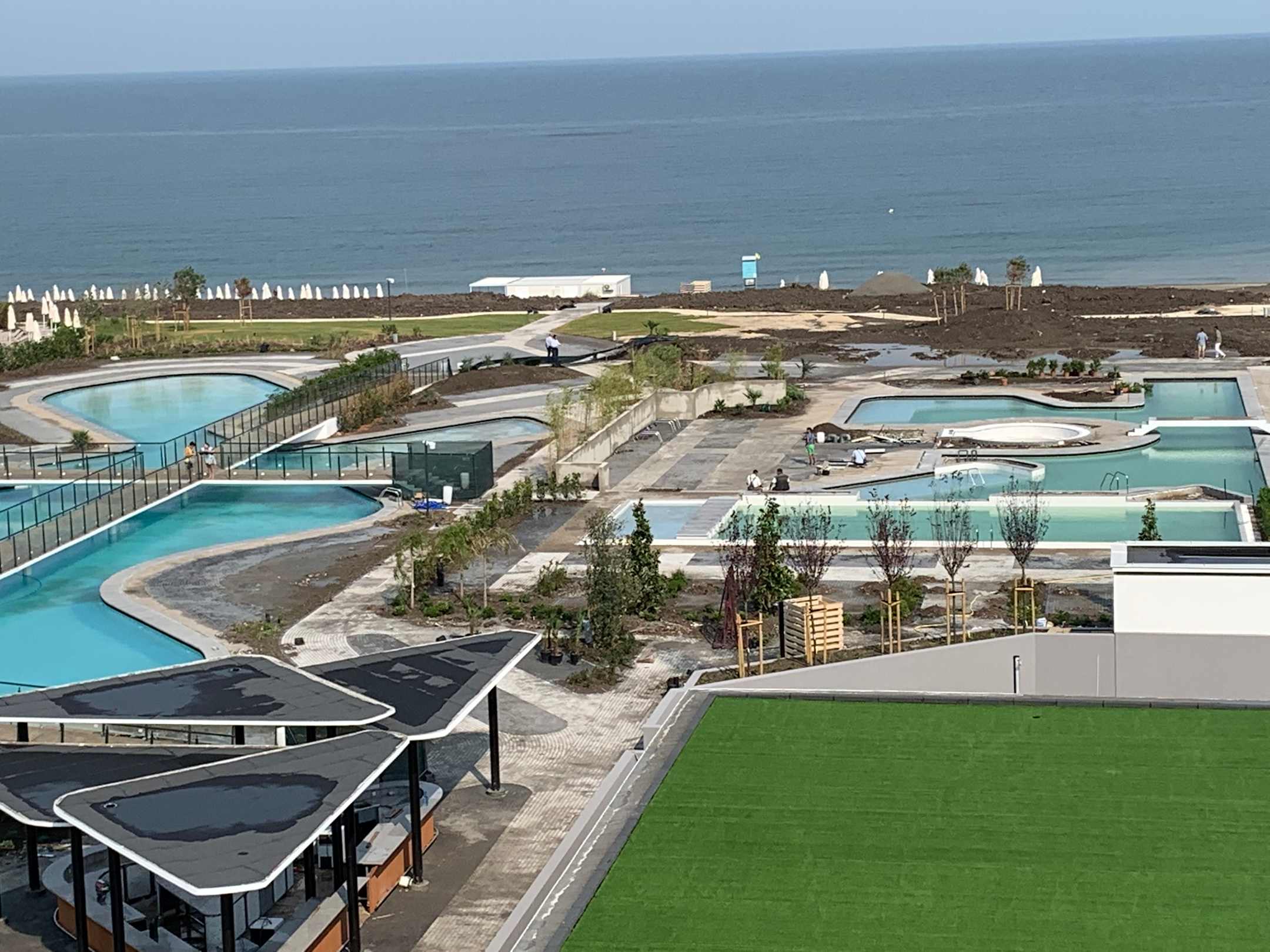Ausblick vom Balkon: rechter Teil wird der ruhigere Teil der Poolanlagen, leider noch nicht fertig