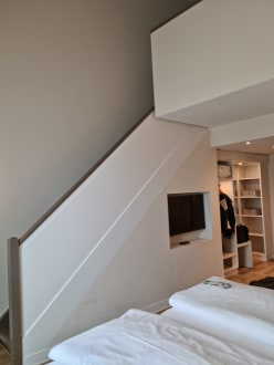 Junior-Suite Deluxe Schlaf-Bereich und Treppe zur Galerie in den Wohn-Bereich