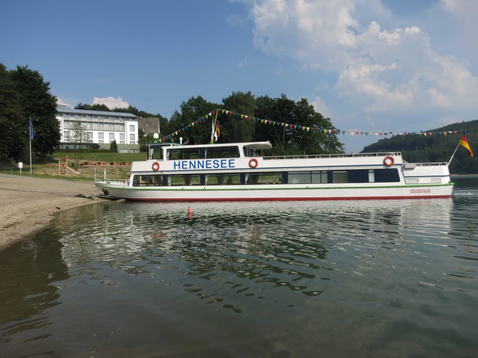 Blick vom See zum Hotel