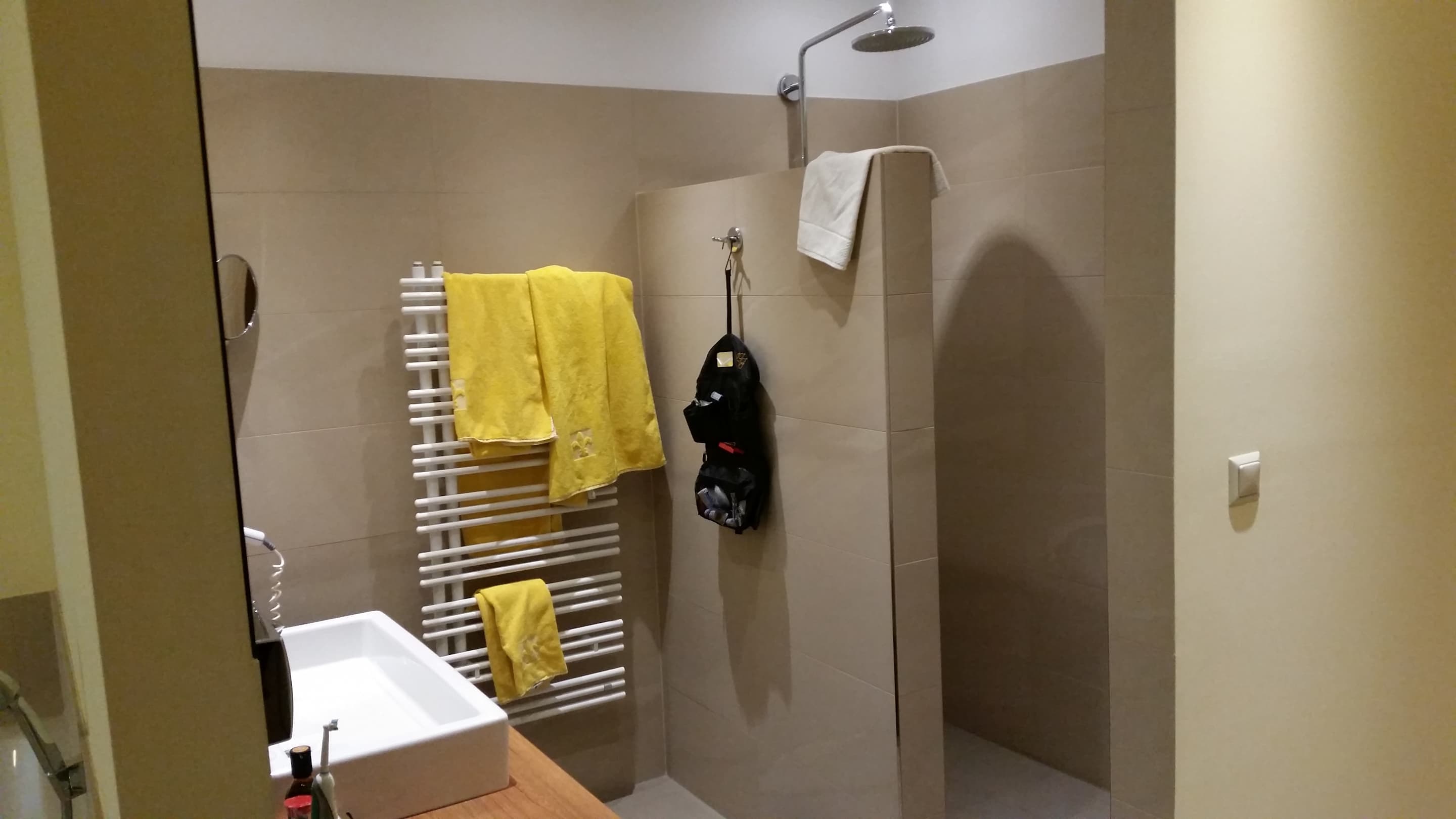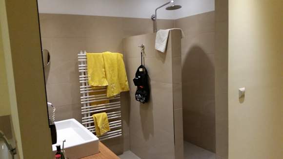 Das Bad der Geniessersuite mit Regendusche und großem Waschtisch.