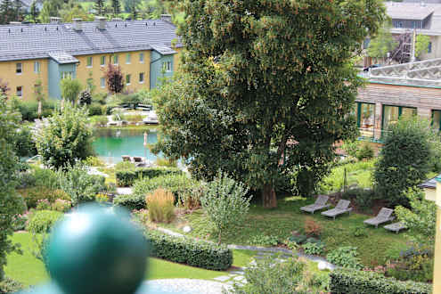Blick vom Zimmer auf den Gartenteich